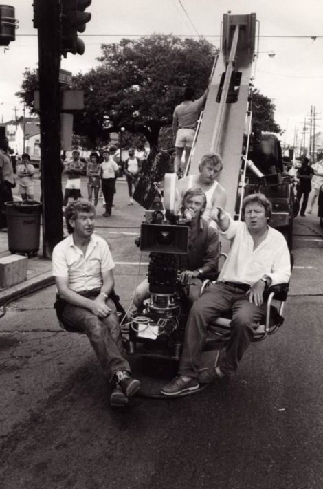 On Magazine Street, we’d built our own 1950’s replication of New Orleans,: the flipside of the postcard cliché. As in New York, we had dressed and clad every single storefront as far as the eye could see in order to be authentic to the period, and drained everything of all primary colours for our monochromatic look. It’s a terrible responsibility for a director to justify the cost of any large set but hopefully all this hard work shows on the film—and there’s always a danger of ‘shooting the set’ instead of the action. All I know is, if you don’t do it all right, that brief moment on film that you end up with, flickering away on the screen 70 foot wide, is almost certain to contain a glaring error. Sitting high up on the Hollywood Chapman crane, I counted the rain-machines atop every building on both sides of the street—the 20 period cars lined up ready for the take and down below Brian Morris’ army of painters, carpenters, dressers and prop men fussing away right up to the moment that I shouted, “Action,” into the loudhailer. With all this effort I wondered why we didn’t build it on the back lot at Shepperton. But we were after a different view of New Orleans than had previously been captured on film and, hopefully, the work was justified. We were in the real place certainly, but New Orleans is a stubborn city and if you’re not careful, like an ageing movie star, it will always offer up the side of its face that it wants people to see.